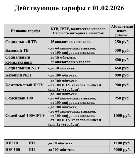 С 01.02.2026 мы вынуждены скорректировать стоимость некоторых тарифных планов. Решение связано с ростом обязательных расходов: налоговой нагрузки, стоимости оборудования и материалов, а также затрат на обслуживание инфраструктуры.